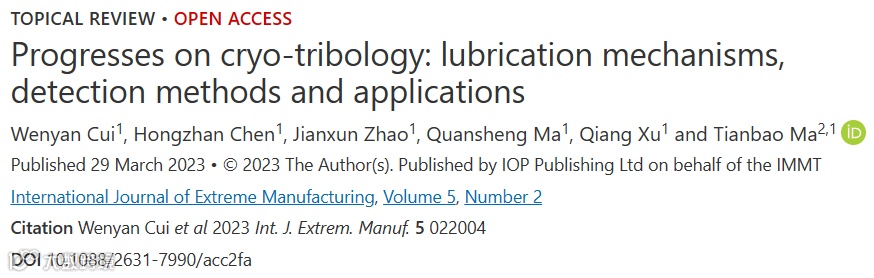 Cui W Y, Chen H Z, Zhao J X, Ma Q S, Xu Q, Ma T B. 2023. Progresses on cryo-tribology: lubrication mechanisms, detection methods and applications. Int. J. Extrem. Manuf. 5 022004.