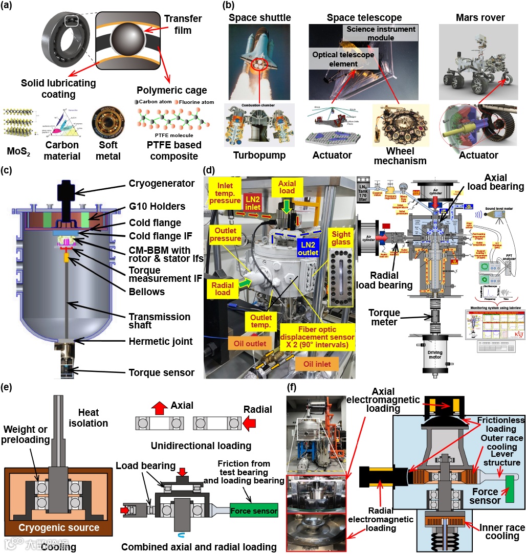 图5 固体润滑滚动轴承低温应用及实验测试技术:(a)固体润滑滚动轴承结构形式(“MoS2”图片经许可转载,Springer Nature;“Carbon Material”图片经许可转载,版权所有(2015),Elsevier);(b)低温固体润滑滚动轴承在航天领域的应用(Space Shuttle图片来自NASA;Turbopump图片允许公众使用,NTRS;James Webb Space Telescope、Actuator图片来自NASA;Wheel mechanism图片经许可转载,IOP Publishing,Ltd;Mars Rover图片来自NASA);(c)欧洲航天局ESA(图片经作者许可转载)和(d)韩国科学技术研究院(图片经许可转载,版权所有(2018),Elsevier)研制的用于低温滚动轴承摩擦力矩测量装置;(e)滚动轴承常用摩擦测量方案及(f)一种新型超低温真空轴承试验机,用于低温真空环境固体润滑滚动轴承高精度摩擦系数测量