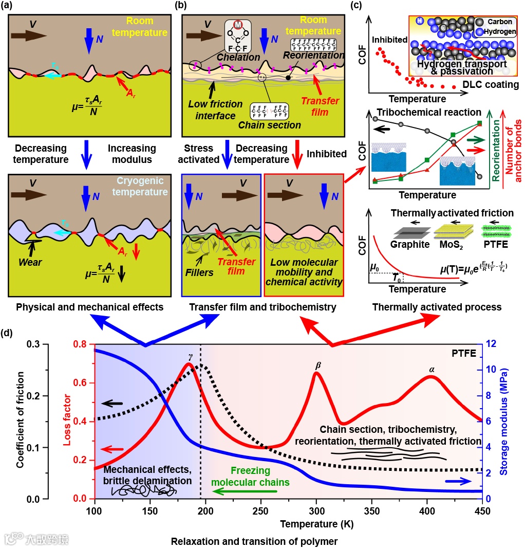 图3 固体润滑材料低温摩擦磨损机理总结:(a)物理机械性能变化;(b)转移膜与摩擦化学;(c)热激活过程;(d)聚合物松弛转变