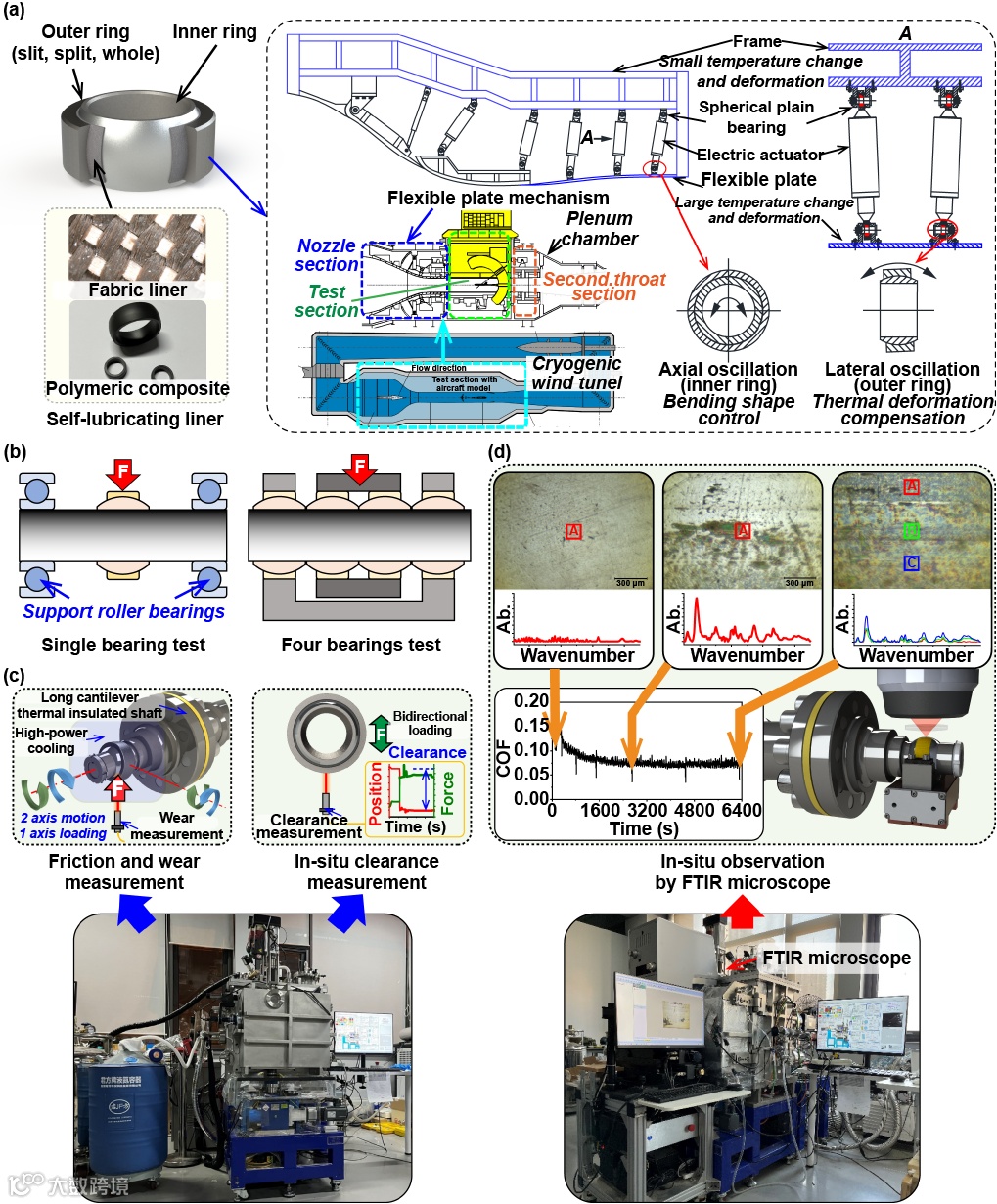 图4 自润滑关节轴承低温应用及实验测试技术:(a)自润滑关节轴承的结构及其在低温风洞中的应用(低温风洞图片经许可转载,版权所有(2011),Elsevier);(b)关节轴承摩擦测量常用主轴方案;(c)低温宽温域关节轴承测试平台及(d)低温工况半外圈关节轴承内圈摩擦表面原位在线观测