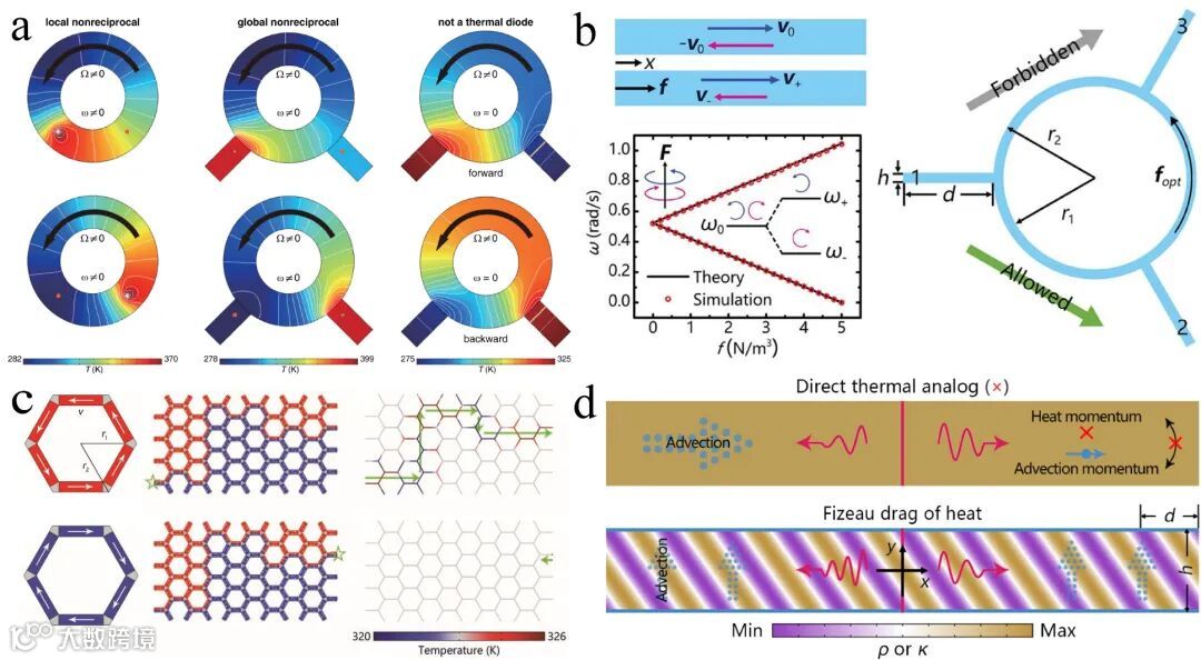 在此基础上,研究人员提出所谓热对流不局限于实际物质的移动导致的对流,材料参数随时空的变化也能产生等效对流,从而有望带来对流所具备的效果。这一想法最先在电学系统中被用来成功实现了电荷的非互易输运,然而当这一理论被移植到热学超材料的设计中时,却产生了争议。其疑点在于,虽然热量与电荷的传输都属于扩散系统这一范畴,但受制于物质守恒原理,对于热学而言,作为热能载体的物质是无法凭空产生或者消失的。因此,为了实现对物质密度的时空调制,就一定要有物质实体的移动,但是在此情况下,为调制密度而产生的不可避免的物质流就会与随时空变化的参数彼此相消,而无法带来预期的非互易热传输效果。因此,这一课题还有待深入探讨。