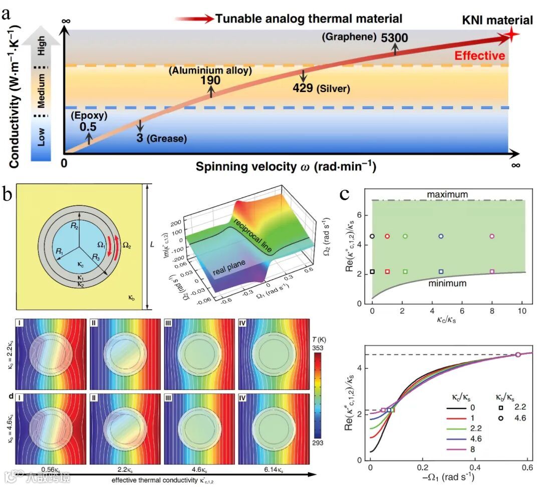 图4 连续可调热导率。(a)传统材料热导率分布图。(b)连续可调的固状对流热伪装器件的结构(左上)、不同转速组合下的互易线(右上)、仿真温度分布图(底部)。(c)可实现散射抵消效应的背景材料热导率范围(上)。相应的散射抵消点(下)。