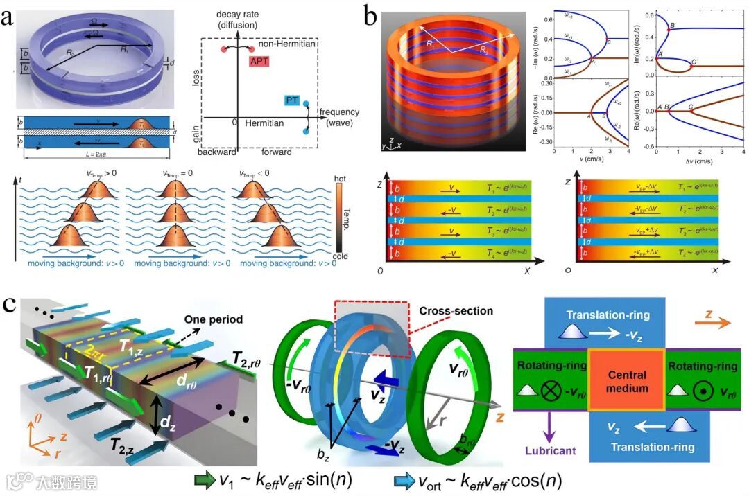 除了能够用于控制传热,对流热超材料还能够丰富我们对于传热过程的物理理解。最近,相关学者探索了对流热超材料与非厄密物理之间的关系。在量子物理中,哈密顿量的厄米性是一个关键的假设,它保证了孤立系统中的概率守恒以及特征值的总实谱。然而,与这一重要假设形成鲜明对比的是,自然界中大多数的物理系统是与周围环境耦合的,因此不可忽视其中能量流动、粒子运动和信息交换的存在。出于能够有效描述开放系统的原因,非厄米物理激发了巨大的研究兴趣。在过去很长的一段时间里,非厄密物理的研究主要集中于波动领域,然而长期以来被忽视的一点在于,由于非厄米性和耗散性质密切相关,传热过程也可以用非厄米物理学这一框架来描述。换句话说,波动系统是本征厄米的,而扩散系统是本征非厄米的。基于这一事实,人们对于桥接波动系统和扩散系统的兴趣日益浓厚。与波动系统需要引入非厄米势能不同,反厄米的热扩散系统需要引入波动性。借助对流对温度场的相位调制机理,相关学者基于反向对流的温度场耦合系统研究了热扩散系统的反宇称-时间(APT)对称性,发现了其中的温度场动态局域效应,并启发了高阶奇异点和环绕奇异点拓扑相变等后续研究。