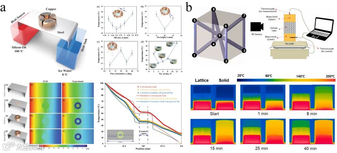 图2 用于冷却的对流热超材料。(a)用于隐身区域温度控制的热超材料。实验装置设定和参数优化过程(顶部)。无隐身器件、传统隐身器件、对流隐身器件之间实验和仿真结果比较(底部)。(b)具备高热阻和强效冷却功能的热超材料。元胞构造(左上),实验设置(右上),加热时的温度分布(底部)。