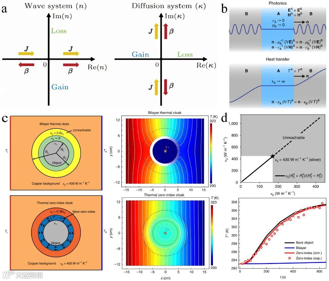 图3 复热导率和等效无穷热导率。(a)波动系统中的复折射率与扩散系统中的复热导率之间的比较。(b)支持电磁波传输的材料参数与支持热传输的材料参数之间的关系。(c)具有铜质背景的双层热隐身斗篷和热学零折射率斗篷。(d)斗篷可实现的背景材料范围(顶部)。斗篷中心温度随时间的演化图(底部)。