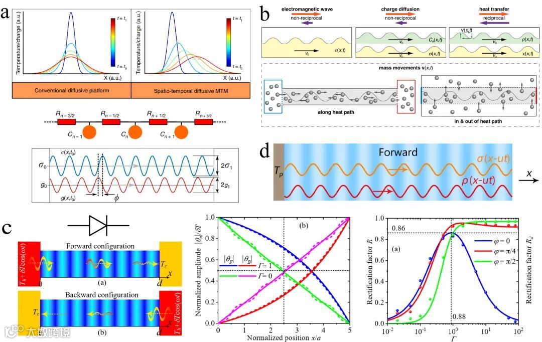 图7 基于时空调制的非互易热超材料。(a)超材料平台操控扩散的概念图(电学类比)。扩散流的空间对称和有效空间非对称(顶部)。对宏观材料特性的周期性时空调制(底部)。(b)动态材料在时间调制下的输运过程。非互易电磁波传播,非互易电荷扩散,互易传热(上)。与传热路径相平行和垂直的两种质量运动(底部)。(c)热播二极管的前后向工作模式,以及相应的温度振幅和整流比。(d)热导率和质量密度的时空调制示意图。