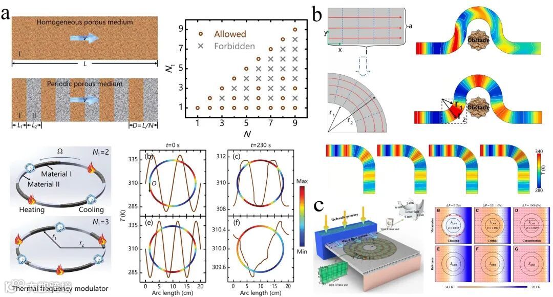 图5 基于多孔介质的对流热超材料。(a)用于波状温度场调制的热学对流扩散晶体。(b)基于多孔介质的热波导。(c)基于多孔介质的功能可调混合热超材料。