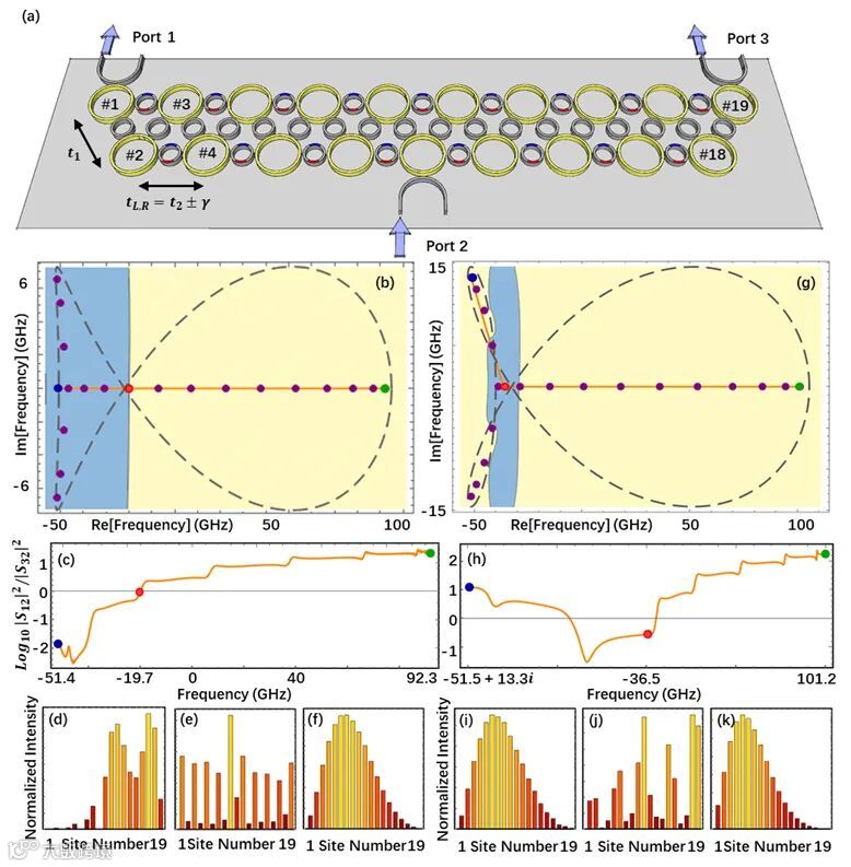 图 3 实现趋肤效应的谐振环阵列示意图 (a)环阵列体系示意图。(b,g) 系统的复频率平面响应,蓝黄色分别对应左、右端堆积的趋肤态。(c,h) 图(b,g)中橙色路径对应的1、3端口透射率比函数。(d~f,i~k)对应图(b~c,g~h)中蓝、红、绿三点的归一化光场能量分布。