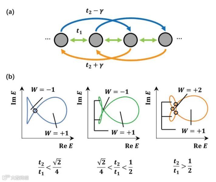 图 2 单原子链模型示意图 (a) 带有非对称次近邻耦合的一维单原子链。(b)三种不同的非厄米趋肤效应相及其边界,从左至右分别为双极、V型以及平凡趋肤效应。