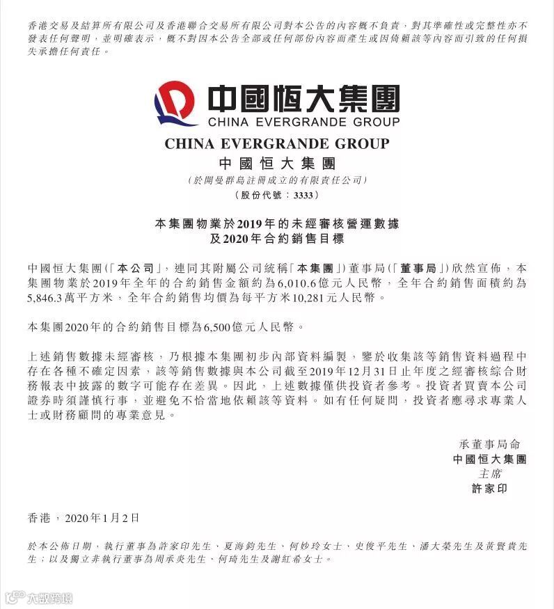 1月2日,中国恒大(HK.3333)发布公告,2019年全年实现销售额6010.6亿元,超额完成6000亿元年度目标。
