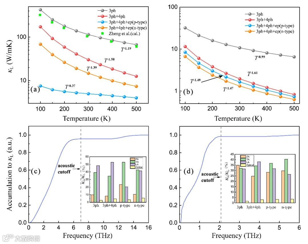 的累计热导率及不同声子支对热导率的贡献,可以看到光学支声子对热导率的贡献可以忽略不计。并且,在考虑声子间相互作用时,LA声子对热导起主要贡献,当引入电子-声子耦合效应后,TA声子对热导率贡献最大。