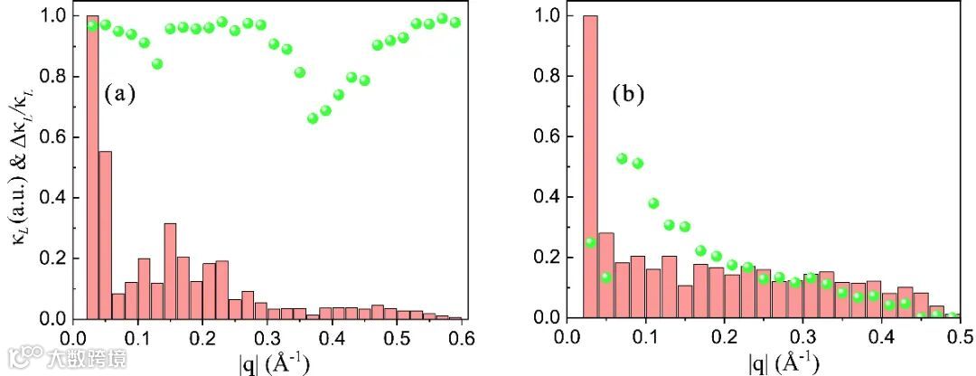 时晶格热导率的变化量,可以看到在很宽的动量范围内,中电子-声子耦合效应显著降低了材料的晶格热导率,下降率均超过60%。