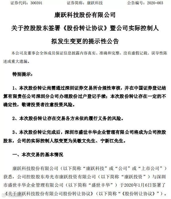 康跃科技1月6日晚间公告,公司控股股东寿光市康跃投资有限公司(康跃投资)与深圳市盛世丰华企业管理有限公司(盛世丰华)于1月6日签署股份转让协议,康跃投资将向盛世丰华转让其持有的康跃科技29.9%股份,转让价格为8.8486元/股,转让价款共计9.27亿元。盛世丰华将成为康跃科技控股股东。