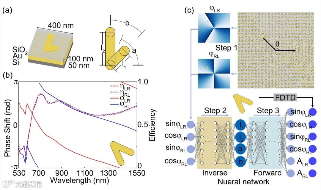 在这项工作中,该团队提出了一种基于深度神经网络的多功能涡流光生成器的智能设计方法。基于扫描参数的反向设计需要先验的物理知识和物理直觉,适用于几何自由度较小的纳米结构。深度神经网络在训练过程中从数据集中智能地学习底层物理知识,能够在没有先验物理知识和物理直觉的情况下处理复杂的纳米结构。数据集中的纳米结构是有限的。如果设计目标不在数据集中,则需要插值,当纳米结构复杂且丰富时,这可能会给器件带来很大的误差。然而,深度神经网络基于从数据集学习到的知识推荐纳米结构。因此深度学习不需要插值。