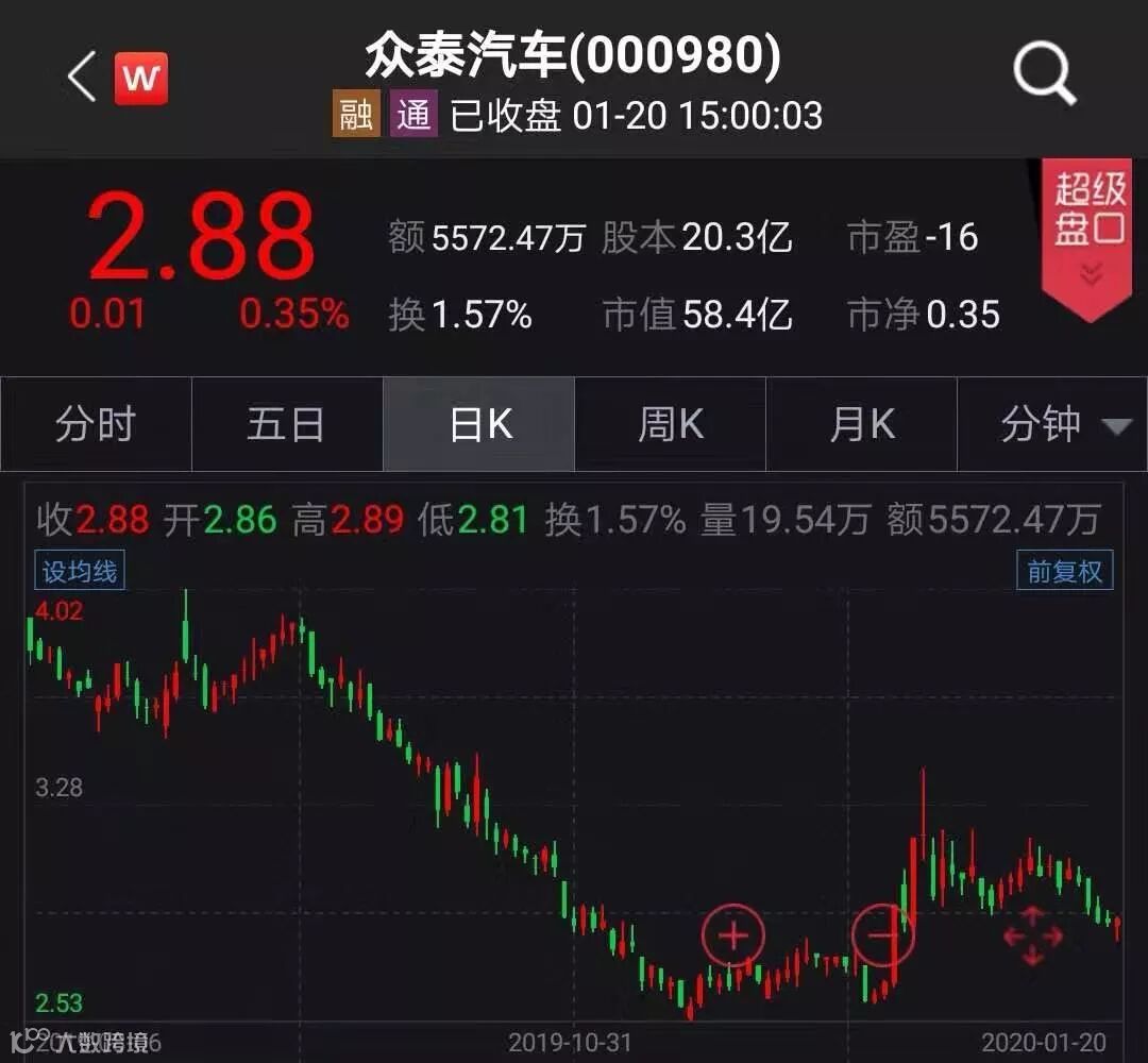 相对于60亿元的商誉而言,截至1月20日,众泰汽车收盘股价报2.88元/股,总市值才58.4亿元。