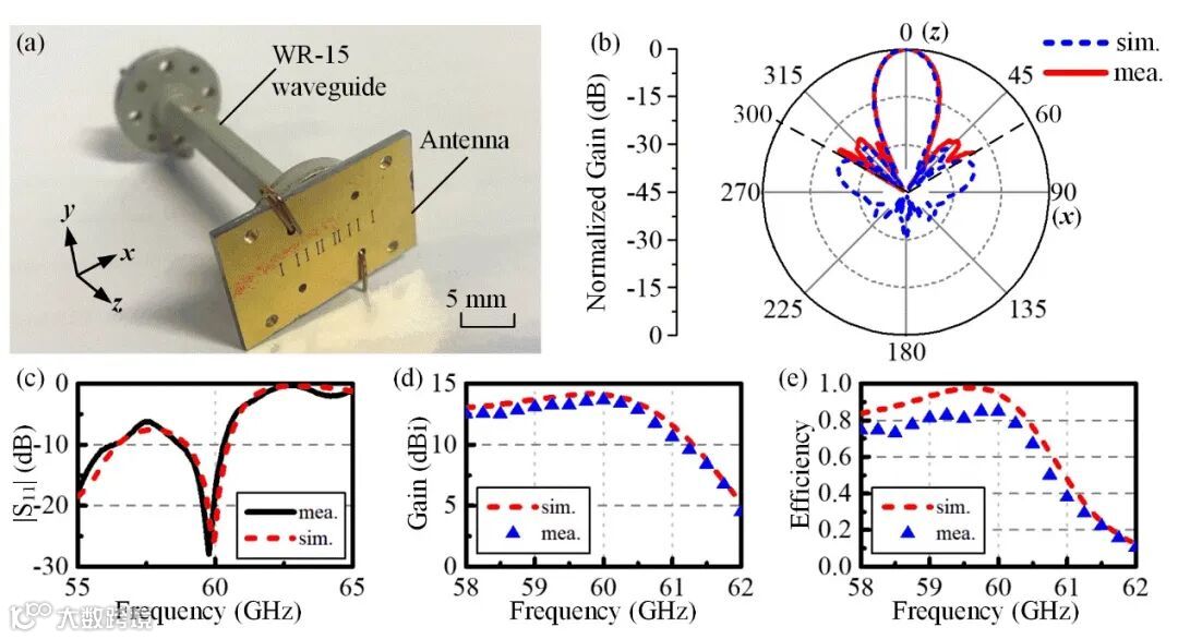 图2 | 低副瓣毫米波天线阵列样机的实物照片与测试结果:(a) 天线样机实物照片;(b) 实测与仿真的天线辐射方向图;(c) 实测与仿真的端口辐射系数;(d) 实测与仿真的天线增益;(e) 实测与仿真的天线效率。