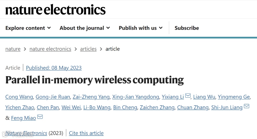 近日,南京大学物理学院缪峰教授、梁世军副教授团队基于忆阻器的存内计算特点,提出并实现了并行存内无线计算原型通信系统。该工作的相关研究成果以「Parallel in-memory wireless computing」(并行存内无线计算)为题于2023年5月8日在线发表在电子学国际顶级学术期刊《自然·电子学》(Nature Electronics)上。