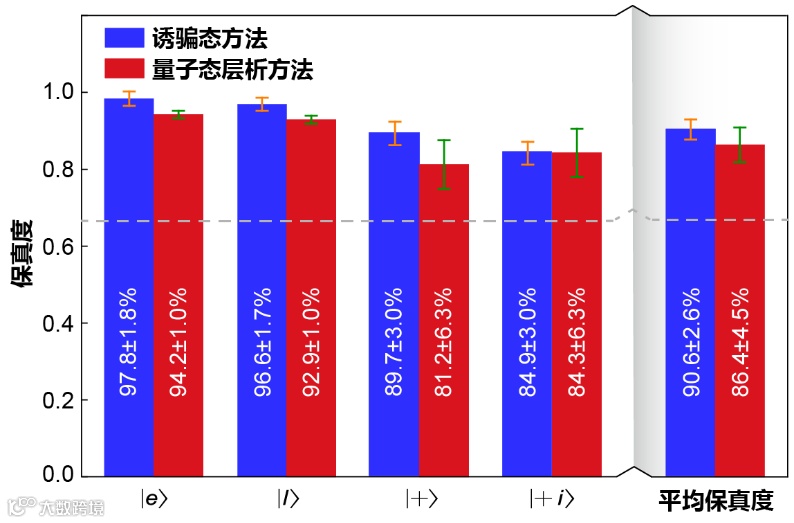 进一步地,研究团队分别使用量子态层析及诱骗态方法(见图2)获得隐形传态的保真度均大于经典极限(66.7%),并通过三重符合测量得到量子态传递速率,证实了高速城域量子隐形传态得以实验实现。