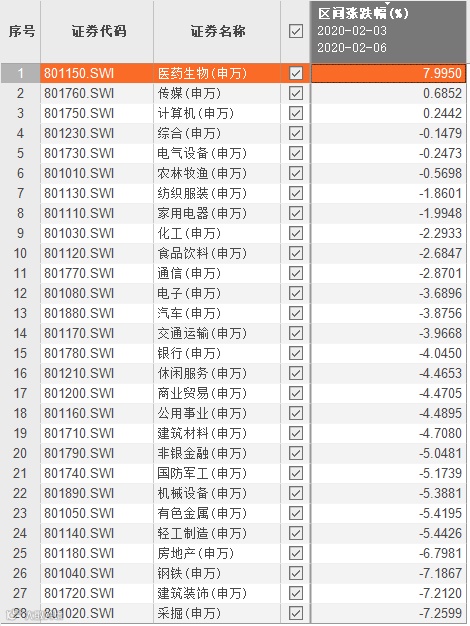 Wind数据显示,春节后首个交易日(2月3日)至2月6日,28个申万一级行业仅三个实现正收益。医药生物行业以7.99%的涨幅傲视全场名列第一,第二名和第三名的传媒、计算机涨幅均不到1%