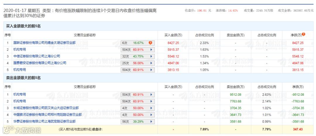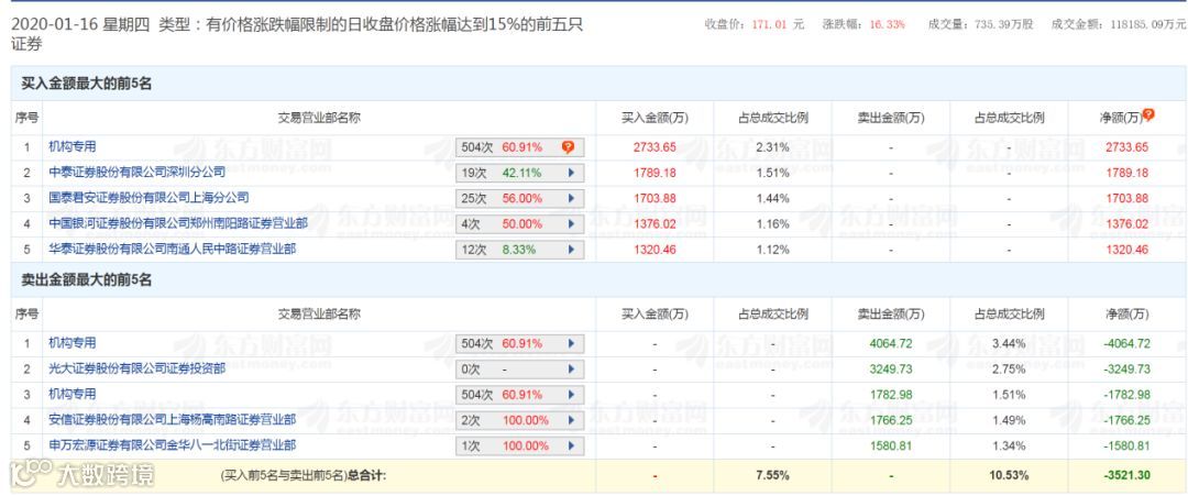 在1月16日中微公司的龙虎榜中,机构席位继续出现,买一的机构席位买入2733.65万元;而在卖出席位中,卖一和卖三的机构席位分别卖出4064.72万元、1782.98万元。