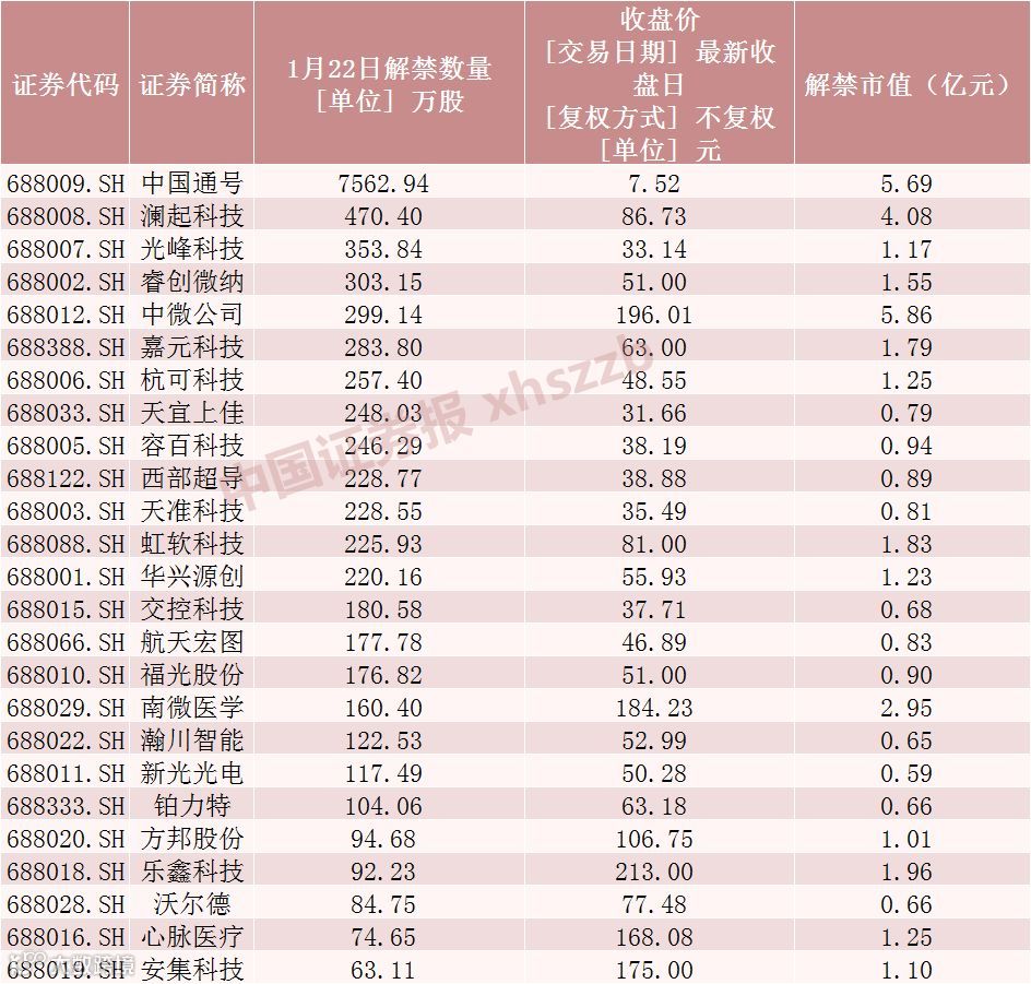 1月22日科创板解禁个股情况