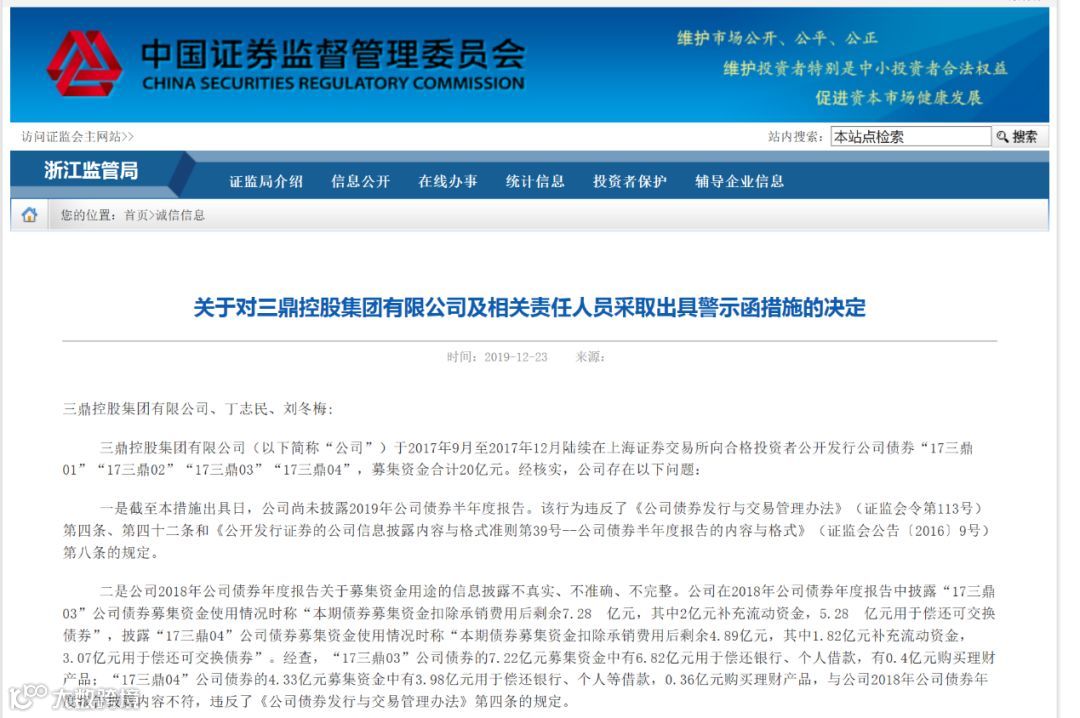在前一天,该证监局公布了《关于对三鼎控股集团有限公司及相关责任人员采取出具警示函措施的决定》。决定书显示,三鼎控股存在的问题主要有两个:一是截至12月23日,公司尚未披露2019年公司债券半年度报告。二是公司2018年公司债券年度报告关于募集资金用途的信息披露不真实、不准确、不完整。