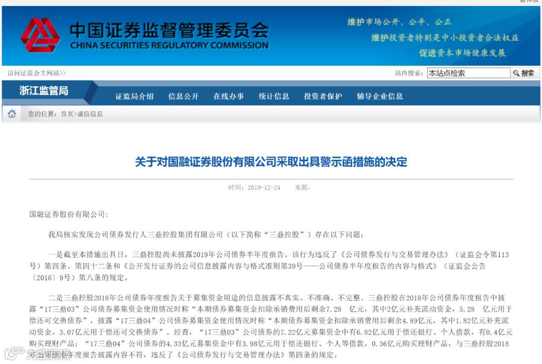 12月24日,浙江证监局对其发出的采取警示函措施的决定书显示,核实发现公司债券发行人三鼎控股集团有限公司(以下简称“三鼎控股”)存在两大问题,国融证券作为三鼎控股债券的受托管理人,未能采取有效手段督促发行人及时履行信息披露义务并保证披露信息的真实、准确、完整,未能在债券存续期内有效监督发行人募集资金使用情况,违反了相关规定。