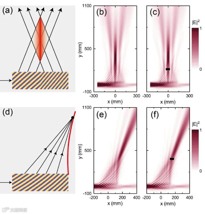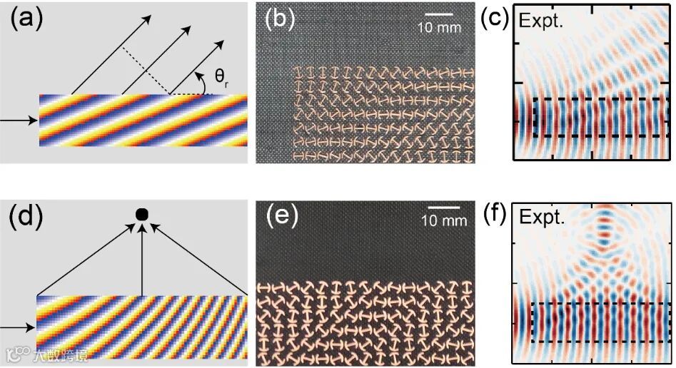 图3 表面波聚焦波前调控。(a-c)表面波偏折调控和(d-f)表面波聚焦调控的示意图、实验样品和实验测试结果。