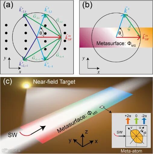 图1基于(a)传统衍射元件和(b, c)超构表面的近场表面波面内波前调控。