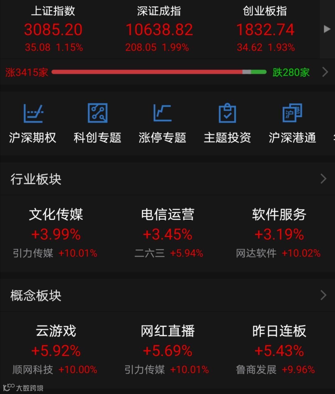 从成交量及板块表现来看,沪深两市合计成交7515亿元,行业板块全线飘红,文化传媒、电信运营、软件服务等行业单日上涨超过3%;云游戏、网红直播、互联网服务、PCB等概念板块领涨。