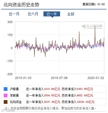 截至1月2日收盘,北向资金自沪深港通开通以来的累计净流入突破万亿元。东方财富网数据显示,北向资金近一年净流入3615亿元。