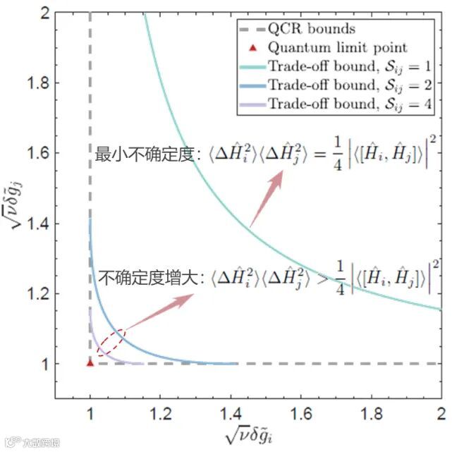 1、通过对不相容参数在实际测量时能够到达的精度下界进行研究,提出了表征不相容性大小的理论判据。该判据表明,在多参数量子估计任务中,可以通过同时增大探测指针关于不相容参数生成元的不确定度,以减弱两个参数在同时估计时精度极限的不相容性,从而使这两个参数的整体测量精度得到提升(如图1所示)。
