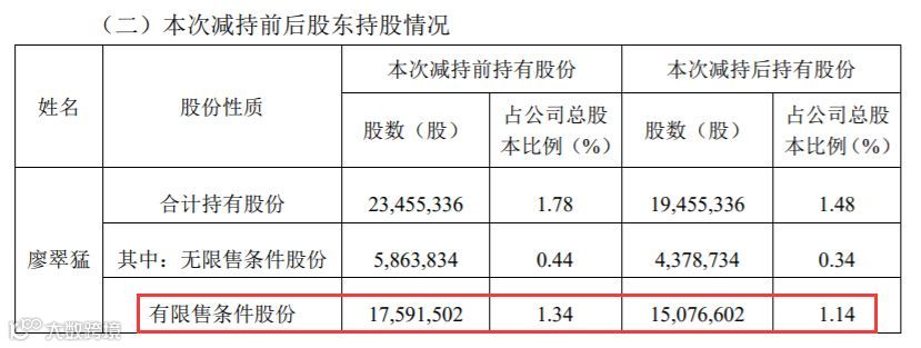 公告显示,廖翠猛所获发行股份购买资产股份于2017年1月11日解除限售,因高级管理人员身份根据相关法律规定每年减持股份不超过所持股份的25%;上述减持计划实施完成后,廖翠猛自公司2018年度报告披露之日起所减持股份总数未超过其所持有公司股份总数的20%。