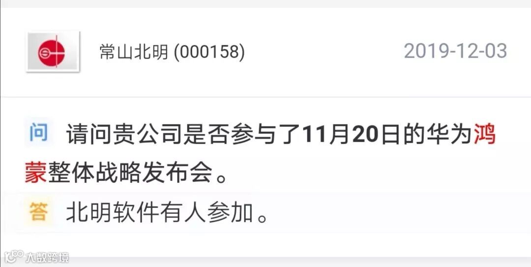 常山北明表示,北明软件有人参加华为鸿蒙整体战略发布会。