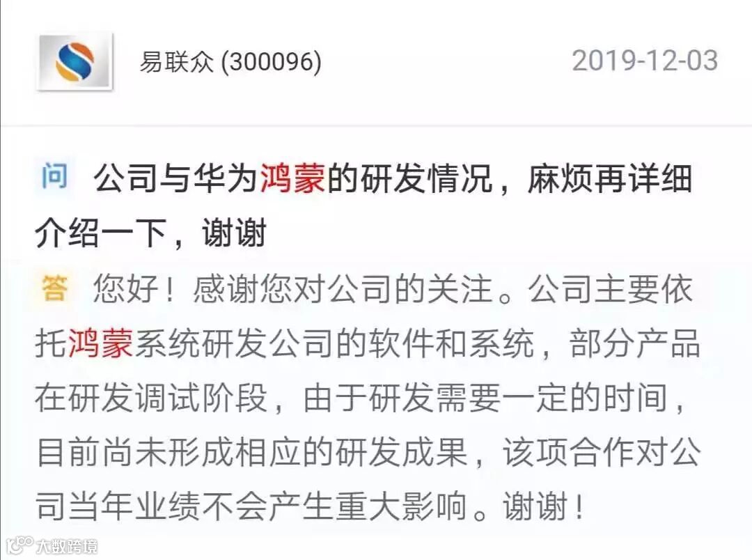 易联众称,公司主要依托鸿蒙系统研发公司的软件和系统,部分产品在研发调试阶段,由于研发需要一定的时间,目前尚未形成相应的研发成果,该项合作对公司当年业绩不会产生重大影响。