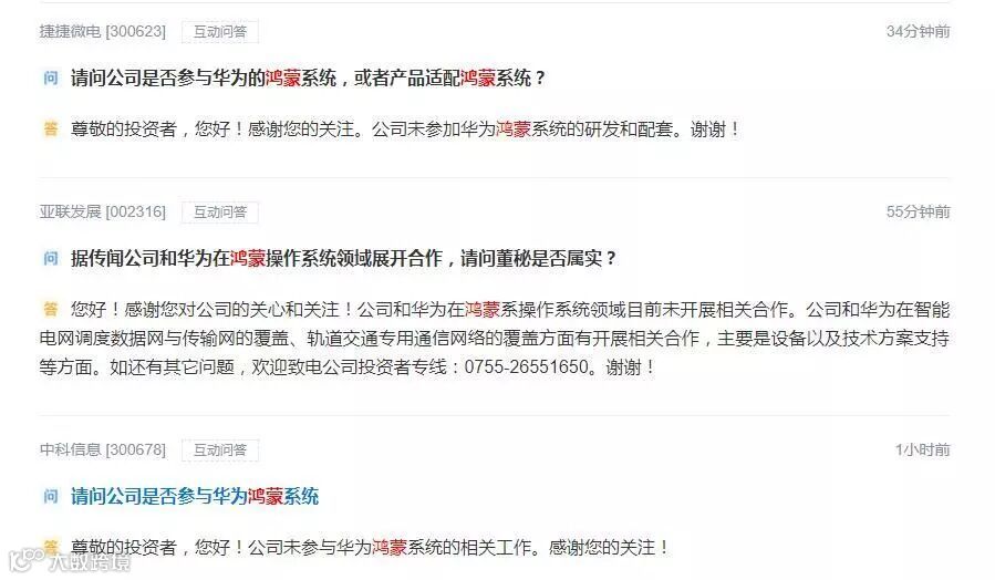 中证君注意到,目前多数被提问公司都回答无合作或者没有参与鸿蒙系统研发。