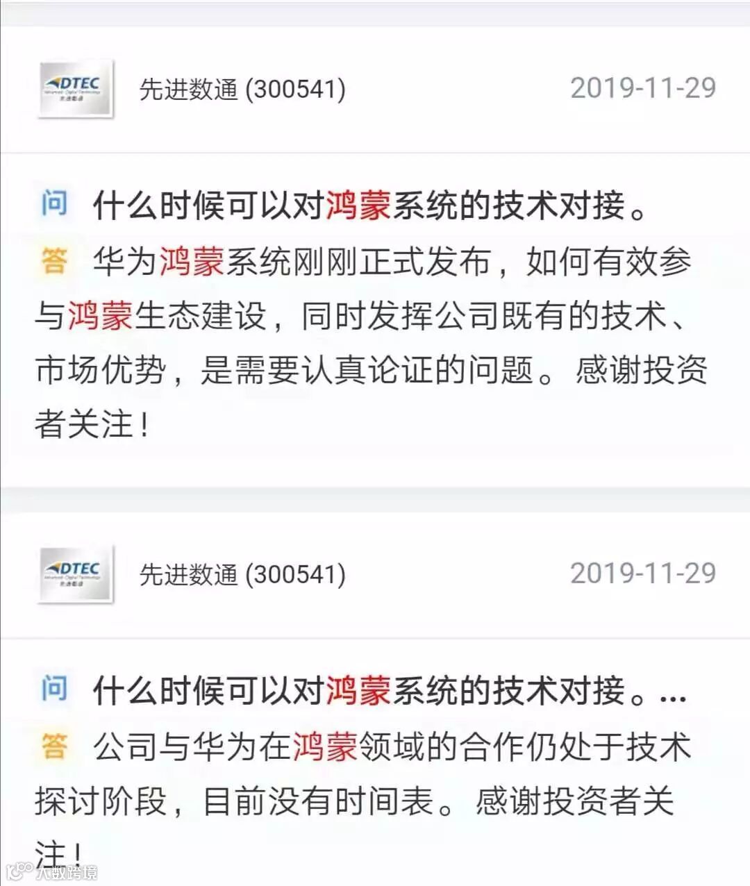 先进数通表示,公司与华为在鸿蒙领域的合作仍处于技术探讨阶段,目前没有时间表。华为鸿蒙系统刚刚发布,如何参与鸿蒙生态,促进鸿蒙生态中的企业级应用,以及如何发挥公司技术与市场优势,是需要认真论证的问题。