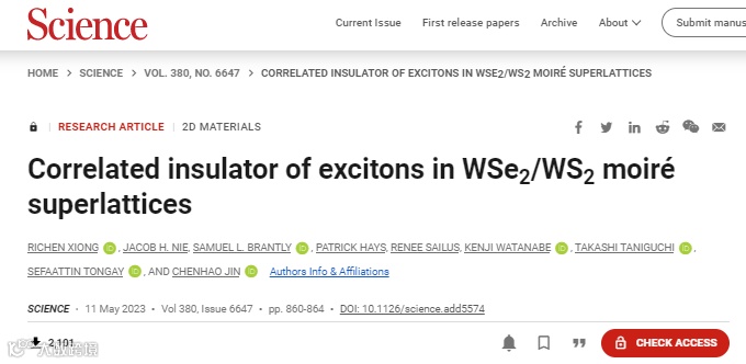 RICHEN XIONG, et al. Correlated insulator of excitons in WSe2/WS2 moiré superlattices. Science, 2023, 380(6647):860-864.