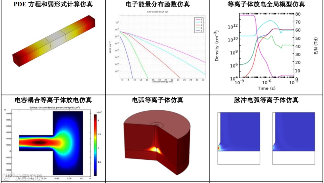 | 专题三:等离子体仿真技术应用专题(点击查看) | 电流/电容/电感/微波/平衡/全局等离子体放电/电击穿/表面反应等 |