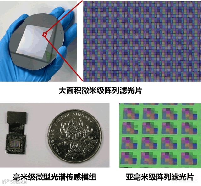 目前,该团队积极探索科研成果转化,采用了微米级紫外光刻技术与纳米级薄膜沉积技术相结合的方法实现了百微米级滤光片阵列以及毫米级(约2mm × 2mm)微型光谱传感模组。未来,该团队还将进一步研发超光谱成像模组及全光谱成像芯片,有望在于天文探测、人工智能、消费电子等诸多领域发挥重要作用。