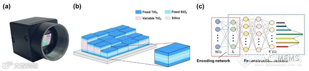 图1 (a) 基于紧凑薄膜结构的微型光谱仪外观;(b) 基于简单薄膜结构的阵列滤光片结构示意图;(c) 基于深度学习的光谱重构算法。