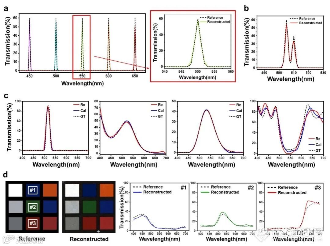 所提出的微型光谱仪可实现对可见光波段(400 - 700nm)样品绝对透射率/反射率的高精度重构,亦可在相同波段实现约2nm的单峰光谱分辨率和5nm的双峰光谱分辨率。此外,本研究还对标准色卡进行了光谱成像,各区域的重构光谱与参考光谱高度吻合。