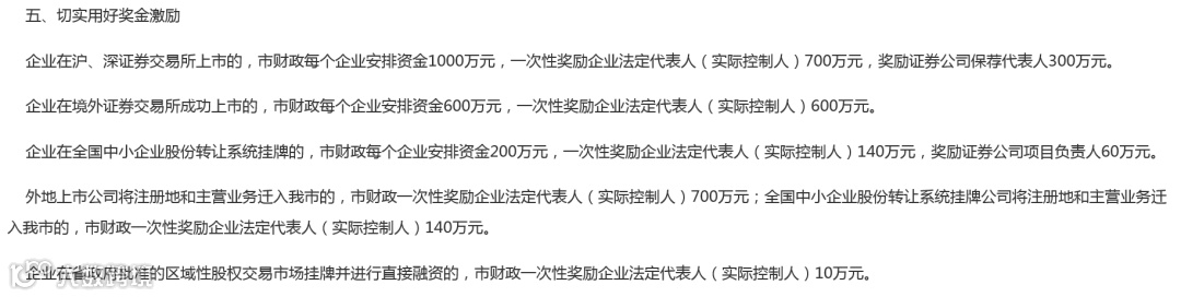 企业在全国中小企业股份转让系统挂牌的,市财政每个企业安排资金200万元,一次性奖励企业法定代表人(实际控制人)140万元,奖励证券公司项目负责人60万元;企业在境外证券交易所成功上市的,市财政每个企业安排资金600万元,一次性奖励企业法定代表人(实际控制人)600万元;企业在省政府批准的区域性股权交易市场挂牌并进行直接融资的,市财政一次性奖励企业法定代表人(实际控制人)10万元。