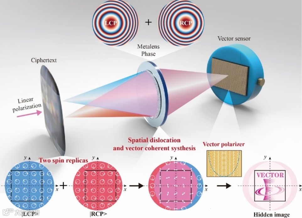 该技术的物理核心是自旋解耦双轴超构透镜实现的按需自旋合成,具体物理过程包括复振幅光学密文的自旋分割、单对双或双对单的空间映射、空间位错复杂干涉等。如图1所示,解密系统由自旋解耦双轴超构透镜(顶部展示了其相位分布)和矢量解偏传感器(如插图所示)组成。自旋解耦双轴超构透镜将编码的光学密文分为两个具有相反自旋态的副本,然后将它们投影到像平面,并产生横向空间错位和重叠(图1底部)。每个像素处的偏振旋向和相位分别由圆形箭头的方向和短导线的方位角表示。作为编码过程的逆过程,位于像平面上重叠合成的矢量光场经匹配的矢量解偏器的帮助下可以再现光学密文中的隐藏图像。相反,如果人眼或者在其它普通成像系统下,所观察到的光学密文呈透明窗口和马赛克图样,这取决于密文的编码方式是纯相位、纯振幅还是复振幅。
