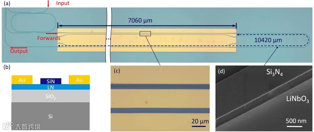 图1(a)光学隔离器的光学显微镜图像;(b) 电光调制器的横截面示意图;(c) 行波电极与波导显微镜照片图;(d)LNOI波导的电子显微镜照片