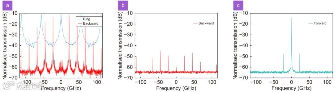 图2(a) 蓝色曲线显示了跑道型微环谐振器的传输光谱。红色曲线显示了反向传播的光在微环谐振器直通端的测量光谱;当使用跑道型微环谐振器抑制边带,在(b)反向和(c)正向操作时,所测量的隔离器光谱。