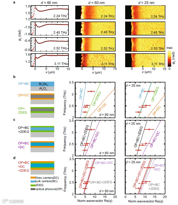 本文还得到了由不同载流子导致的等离极化激元各自的谱线,以及Bi2Se3薄膜厚度对衰逝波色散关系的影响,通过基于不同电导率模型来计算色散关系,发现等离极化激元信号是太赫兹波与无质量Dirac载流子(DP)、有质量二维电子气载流子(2DEG),有质量体载流子(BC)、光声子(OP)同时耦合的结果。相关的实验和拟合数据见图3,其中模型d与实验数据符合地最好。