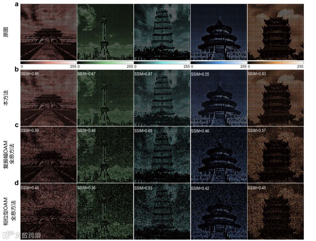 图3. 五个中国地标性建筑256阶灰度图像的OAM复用(2倍超分辨),其中SSIM为结构相似性系数
