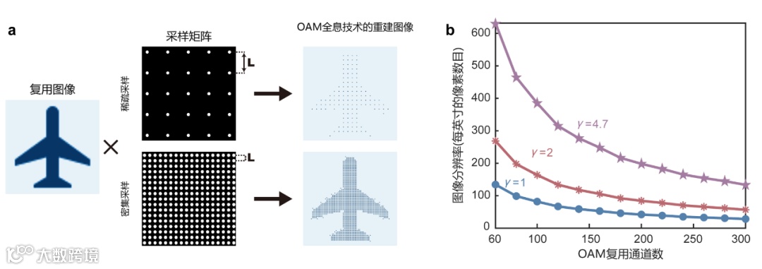 然而,OAM全息图的大容量与高分辨率是一对矛盾。由于全息图的各OAM通道之间存在强烈串扰,为了确保每个像素位置的OAM性质不被破坏,必须对原始图像进行稀疏采样(图1a)——严格要求采样间隔(L)不小于最高阶OAM模式的直径(dmax),即γ=dmax/L≤1。γ=1即对应目前OAM全息技术的分辨率上限,如图1b的蓝色曲线所示,随着复用通道数量增多(dmax增大),图像分辨率损失严重(L同比例增大)。该瓶颈问题极大限制了OAM全息技术的容量和分辨率的提升空间。