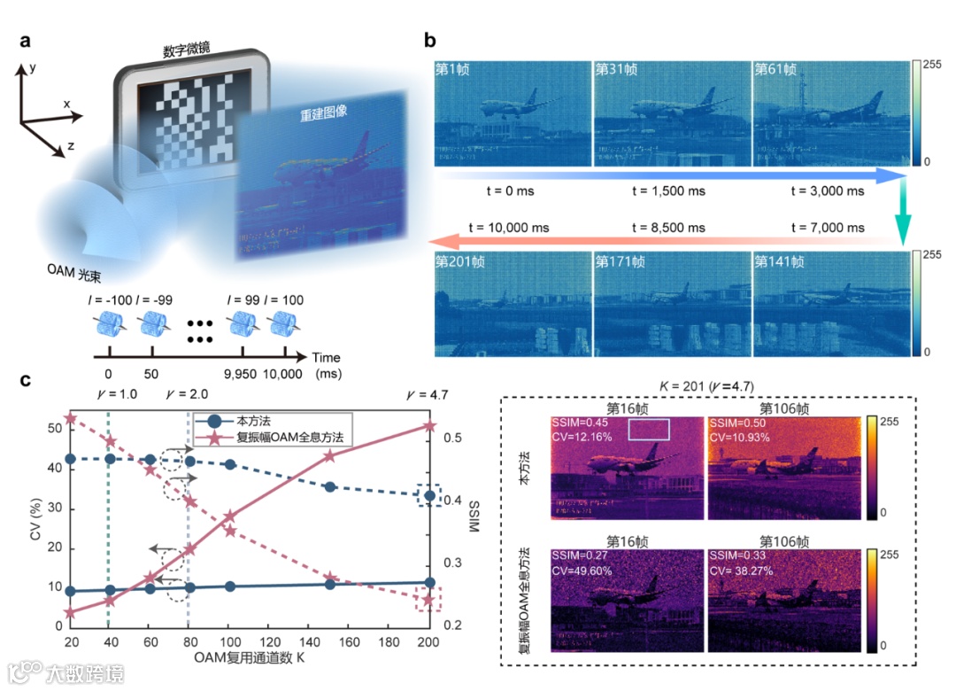 图4. OAM复用256阶灰度图像全息视频(4.7倍超分辨):(a,b)201个不同OAM光束依次照射全息图,获得201帧高质量全息视频;(c)强度起伏系数(CV)、结构相似性系数(SSIM)等评价因子随OAM复用通道数量的变化
